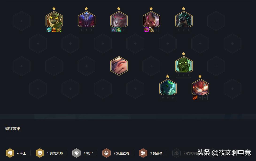 因为这套阵容是以斗士为核心输出的,因此输出核心在努努和劲夫身上,斗士增加生命值上限使得努努轻易触发真实伤害,而4丧尸召唤出来的塞恩也是强度非常高,斗士+丧尸的羁绊能够使得这套阵容顺利强势到前中期,大头和劲夫都是龙族羁绊,因而在过渡时候可以上3龙族将劲夫追到三星。