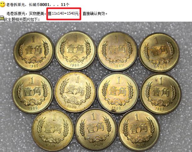 目前,发行量次少的1980年1角,卷拆品相的在140元左右一枚,而1981和1985年卷拆的,是13-14元左右。