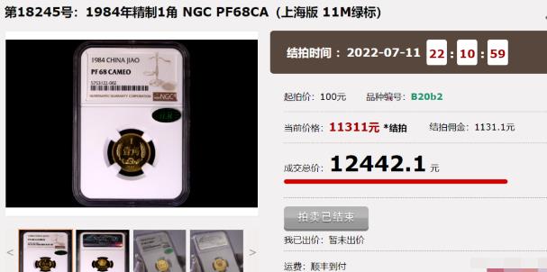 比如1984年1角,NGC 68分,带绿标的,成交价12442元。