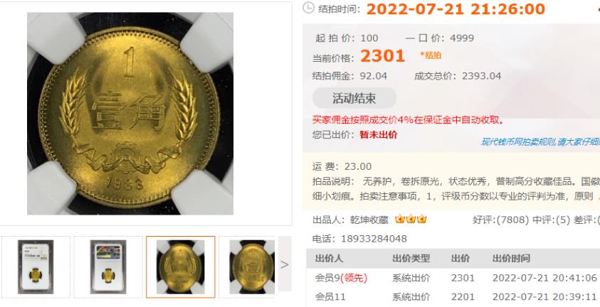 今年7月份,一枚83年普制1角,NGC评分67分,拍出2301元。