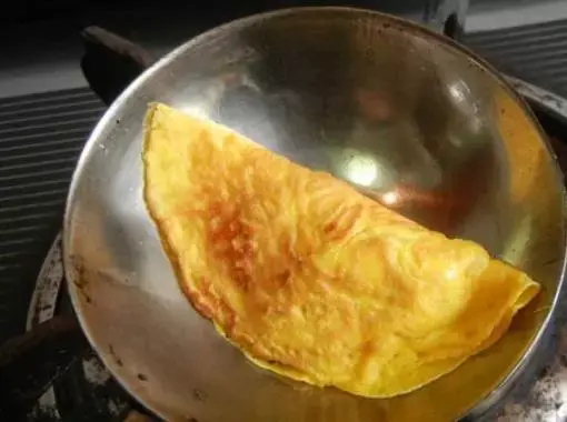 3、如果蛋皮完全凝固了,可以放好肉馅后,在周边抹一圈蛋液,快速对折,轻轻按压,一样可以成型。