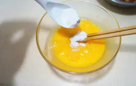 1、将4个鸡蛋打入碗中,打散后,放入少许盐、1小勺约3克的淀粉。