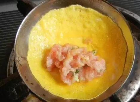 5、在蛋饺皮的一边放入适量猪肉馅。