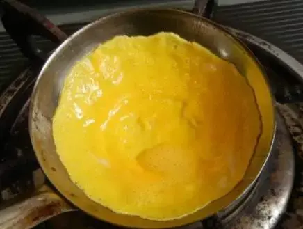 4、煎锅中放少许油润锅,锅热后,舀入一点蛋液,转匀,煎成一张蛋饺皮。