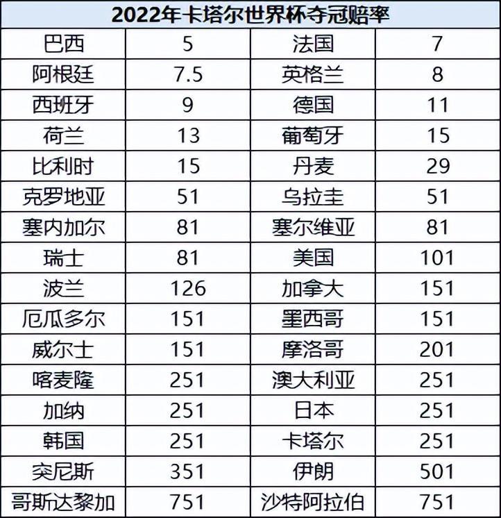 世界杯夺冠赔率:阿根廷第三,葡萄牙第八,沙特垫底