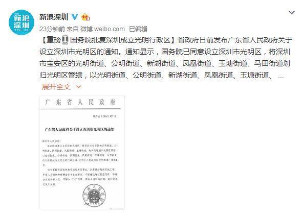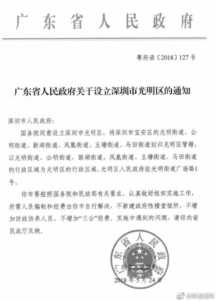 通知显示,国务院已同意设立深圳市光明区,将深圳市宝安区的光明街道、公明街道、新湖街道、凤凰街道、玉塘街道、马田街道划归光明区管辖,以光明街道、公明街道、新湖街道、凤凰街道、玉塘街道、马田街道的行政区域为光明区的行政区域,光明区人民政府驻光明街道广场路1号。