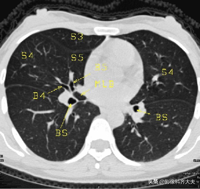 ▲B5:右中叶内侧段/左舌下段支气管,BS:基底干支气管,MLB:中叶支气管,S5:右中叶内侧段/左舌下段