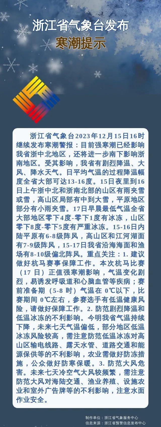 目前强寒潮已经影响我省浙中北地区,还将进一步南下影响浙南地区。受其影响,我省有剧烈降温、大风、降水天气。日平均气温的过程降温幅度全省大部可达13-16度。15日夜里到16日上午浙中北和浙南北部的山区有雨夹雪或雪,高山区局部有中到大雪,平原地区部分有小雨夹雪。