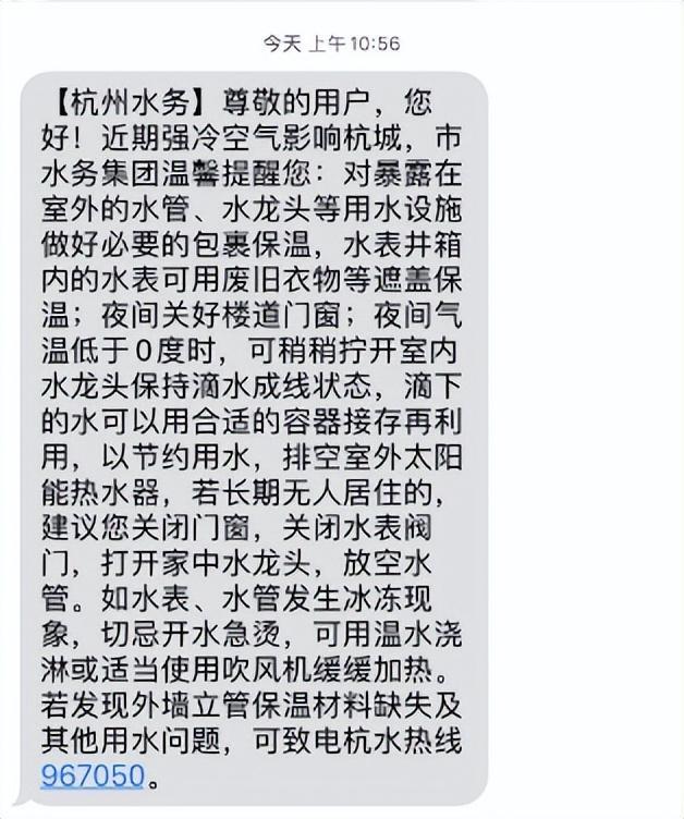 未来几天早晨最低气温将频频跌破零度,请大家对暴露在室外的水管、水龙头等用水设施做好必要的包裹保温;水表井箱内的水表可用废旧衣物等遮盖保温;夜间气温低于0度时,可稍稍拧开室内水龙头保持滴水成线状态,滴下的水可以用合适的容器接存再利用,以节约用水。
