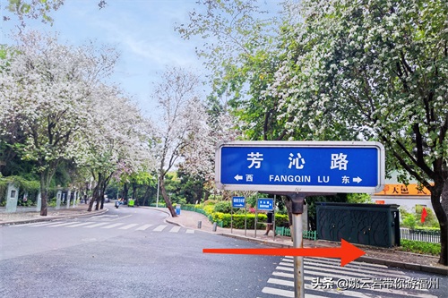 从湖头街进入芳沁路,这时候还有许多羊蹄甲花未凋谢,风景宜人。