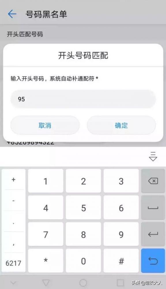 7.输入95,因为我们要拦截所有95打头的骚扰电话,系统会自动补充余下的位置