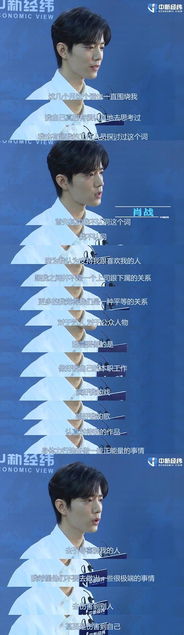 在采访前直白的回应这个问题对于一个偶像来说并不简单。这两个多月以来争论的焦点之一就是说肖战没有管好粉丝,可是每一个粉丝都是一个独立的个体。小时候由父母老师教导,长大之后更多的是自己约束自己,从来都没有由偶像来管理的道理,偶像对粉丝永远只能算起引导作用。而当你稍微去了解一点就会知道,肖战始终都在为自己的粉丝传递正能量。