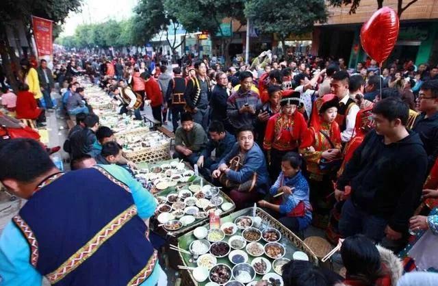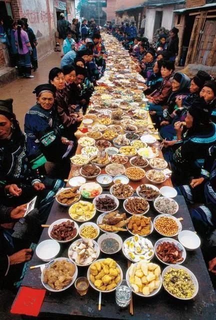 哈尼族人最热闹的要数“长街宴”,村寨老少聚集在一起,在长条一般的宴席上,吃喝谈笑,每家每户,都会做拿手好菜,摆在街上的长条上,菜做得越香受到欢迎,自己越体面。