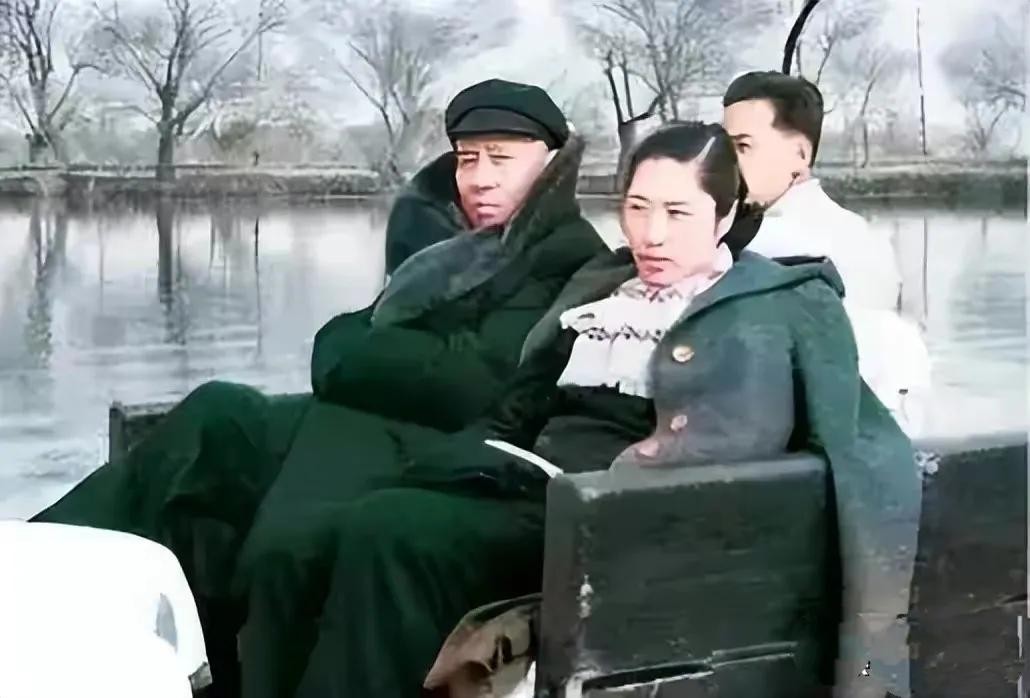 1952年冬,少奇同志和夫人王光美在中南海上划船的合影,中南海冬天的水上美景尽收眼底。