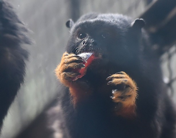 赤掌柽柳猴,体重约400-550g,体毛以黑色为主,黑色的脸庞、大大的耳朵,犹如精灵一般。手掌和脚掌处四周长有非常显眼的金色毛发,就像是戴了手套,搭配了同色系的袜子。高高的袜筒完全get到了本季时尚的精髓—袜子外穿,颜色一定要够吸睛。