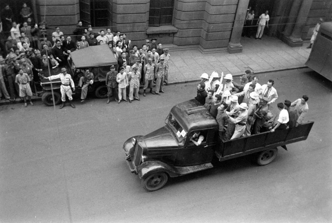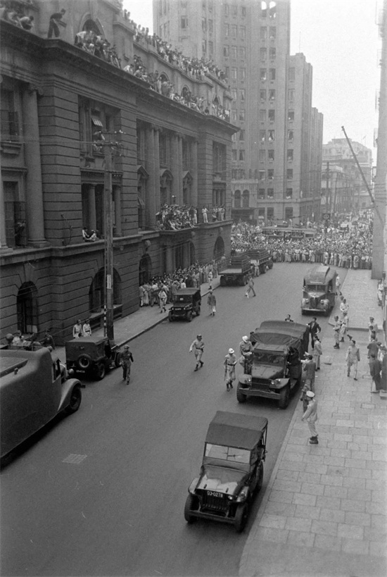 上海市银行门口,挤满了围观的人群,载有5名囚犯的汽车即将从这里经过。