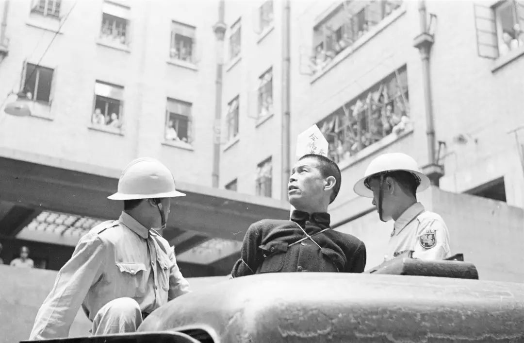 5月11日,上海警察局大楼的职员,纷纷从窗户和阳台上,观看即将押送刑场的5名囚犯。