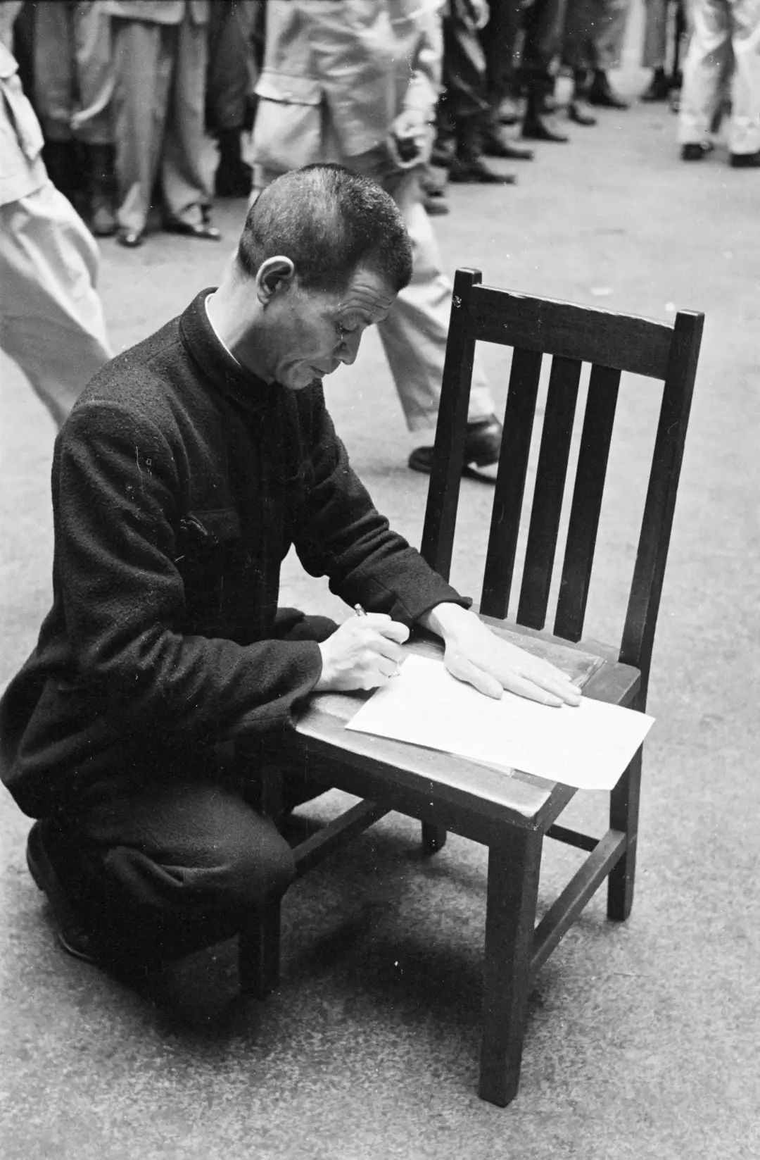一位衣着整洁的犯人,正在椅子上写遗书。从他面上的表情看,他丝毫没有畏惧之色!这位犯人的名字叫陈惕庐。