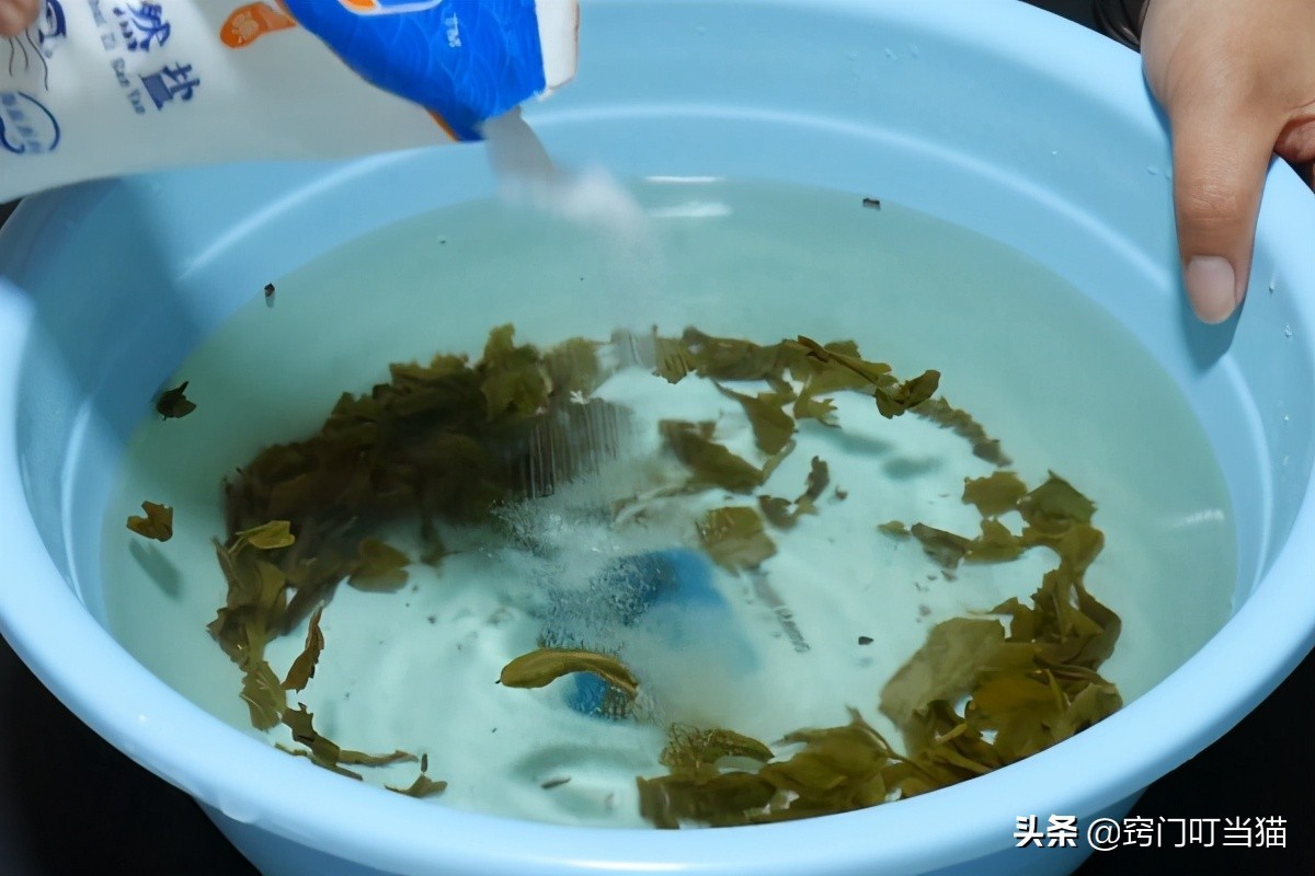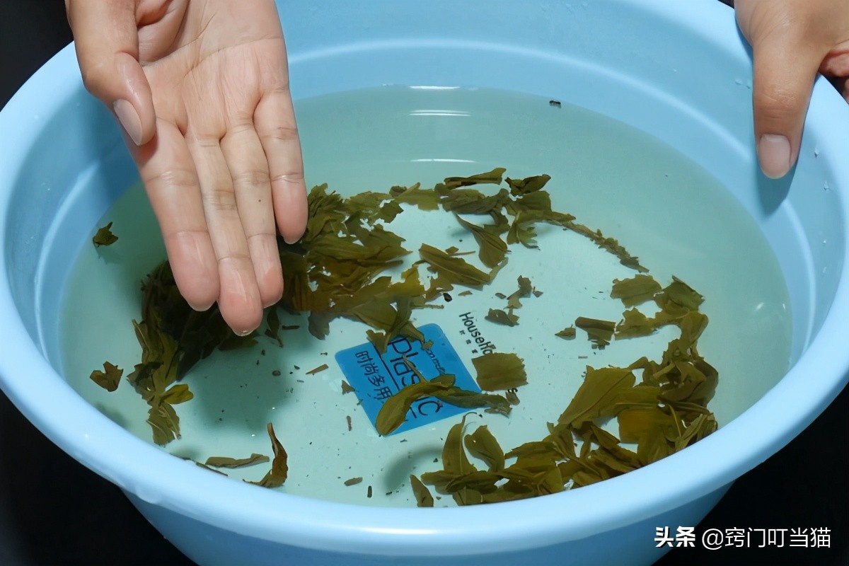 首先我们准备一个干净的脸盆,在盆里面倒入一些茶叶,最好是用这种绿茶,茶叶可以多倒一些,再倒入适量的开水,将盆里面的茶叶全都泡开即可,倒好水后我们让它静置一会,茶叶水中含有茶碱等物质,有固色的作用,而且还能去除异味。