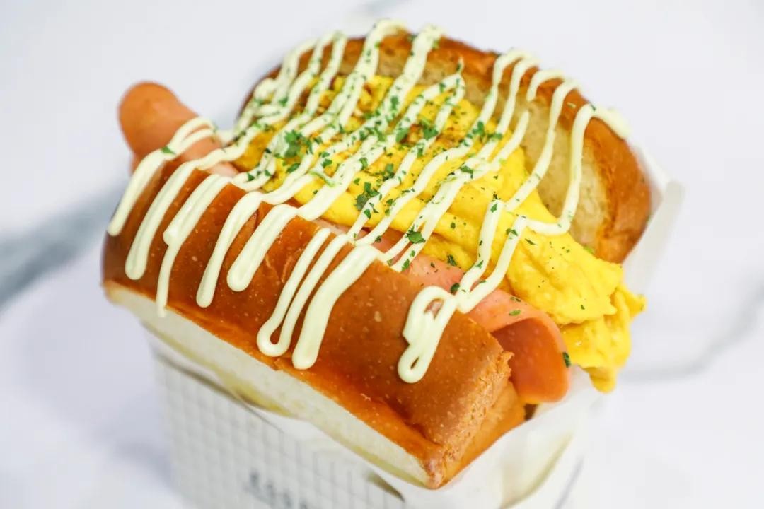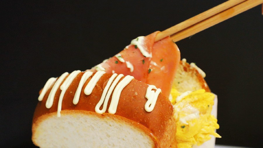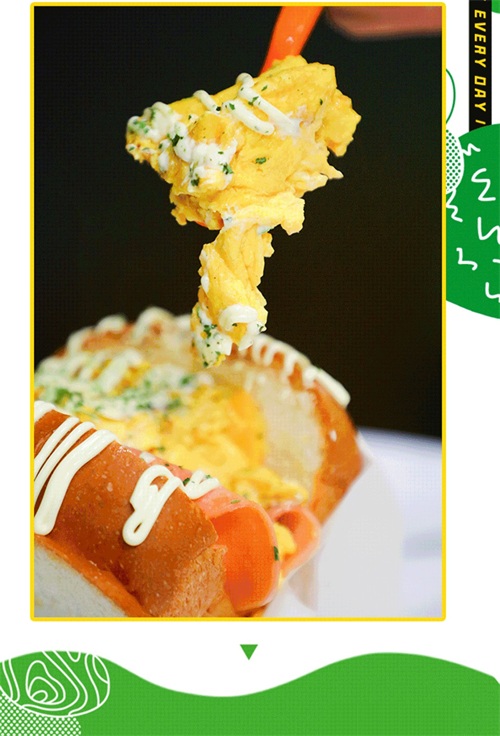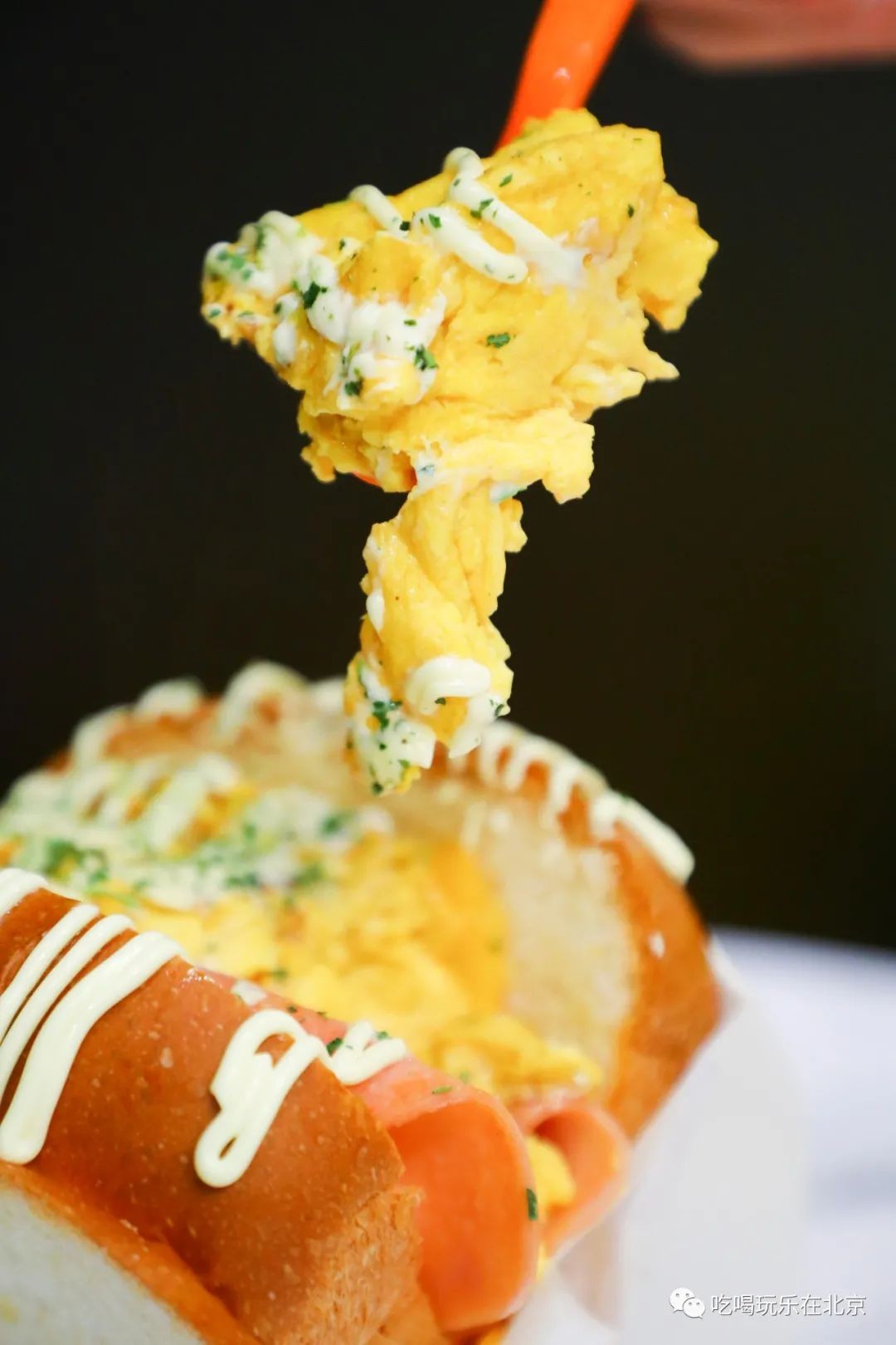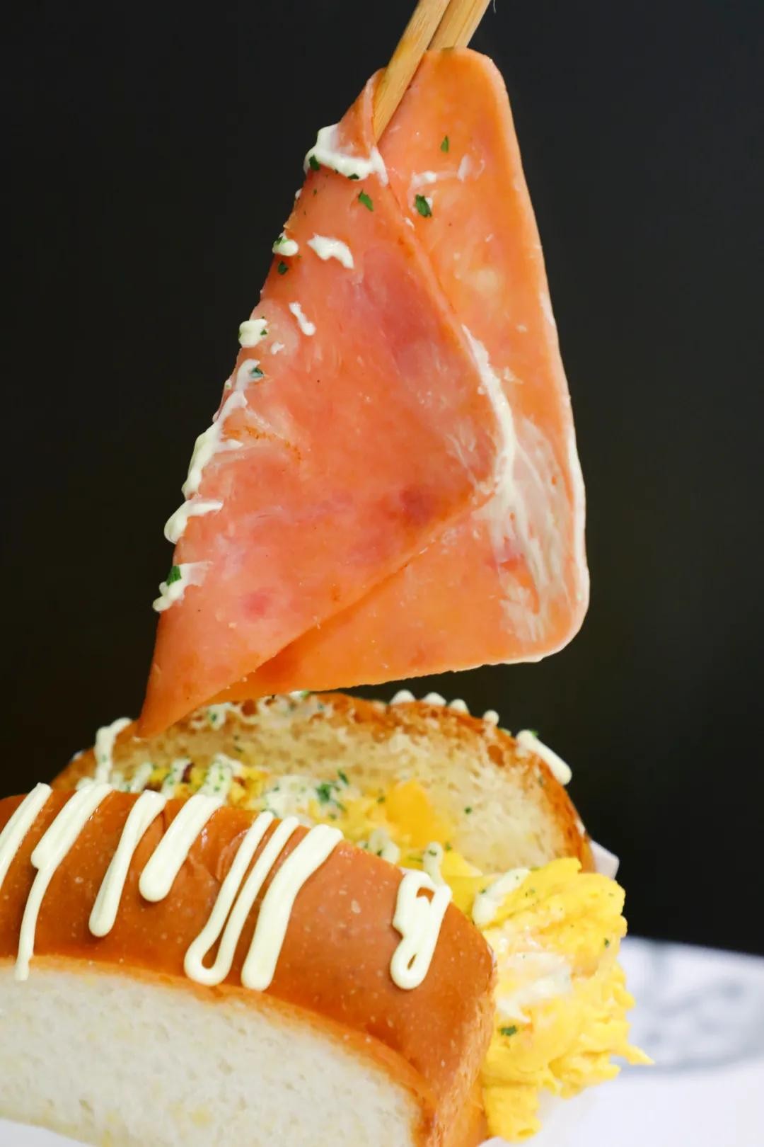 吐司烘烤的外皮酥脆,滑蛋现点现炒,还有食肉族最爱的火腿片也少不了。再加上沙拉和蛋黄酱,分量超级足,一个就顶饱。