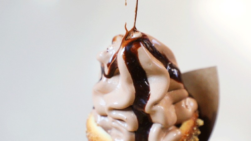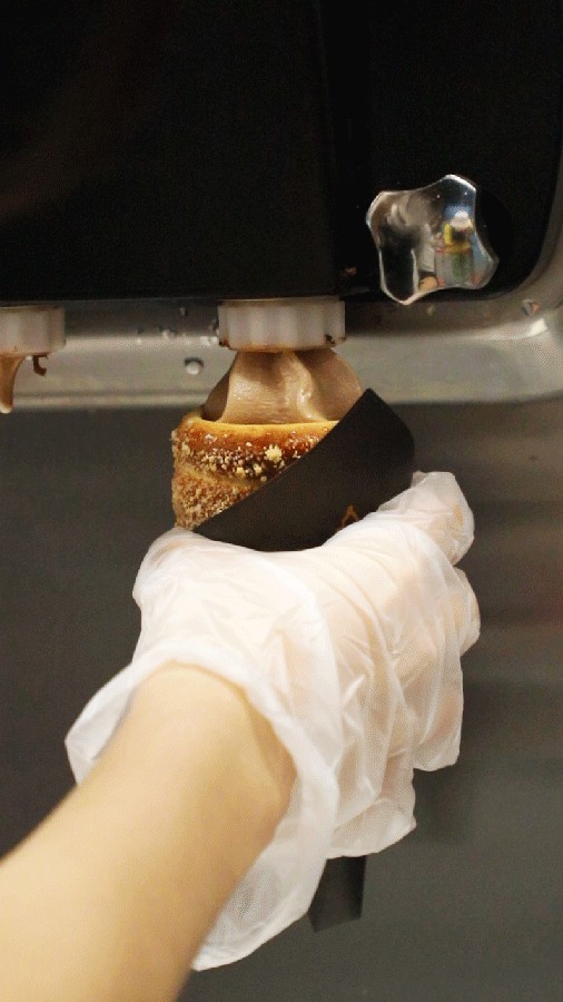 我要的坚果冰激凌,烟囱卷是现烤的,口感类似脆脆的面包。巧克力味的冰激凌浓郁而丝滑,一口入魂!