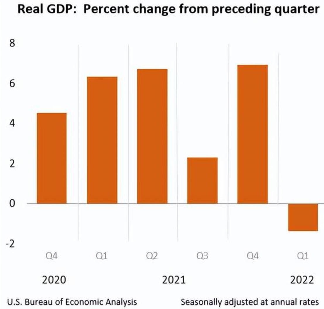 根据美国商务部一季度的数据显示,美国GDP一季度年化环比下降1.4%,而市场预期是增长1%,这里就有2.4%的差距。这是2020年美国宽松以来,经济最为疲软的一个月!