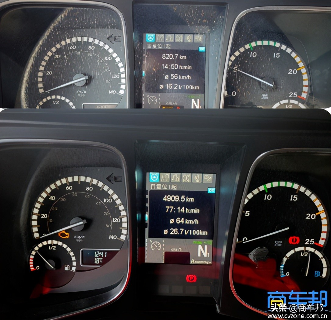 “第一张(上图)是提挂车返程的时候拍的,车头加上集装箱骨架挂车,跑出来16.2个油;后面这一个(下图)是上一趟从上海去新疆伊犁的油耗,拉的两个集装箱29吨,加上车子一共四十来吨,最后卸车时拍的油耗(26.7L/100km)。”