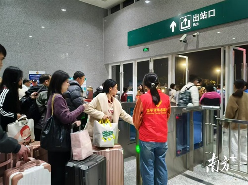 春运期间,饶平站客流高峰迭起,志愿者们甚至主动延长服务时长。部分志愿者坚守到晚上11时左右,直到最后一趟列车驶离。他们与工作人员默契配合,在寒夜中热情耐心地迎接每一位归乡旅客。