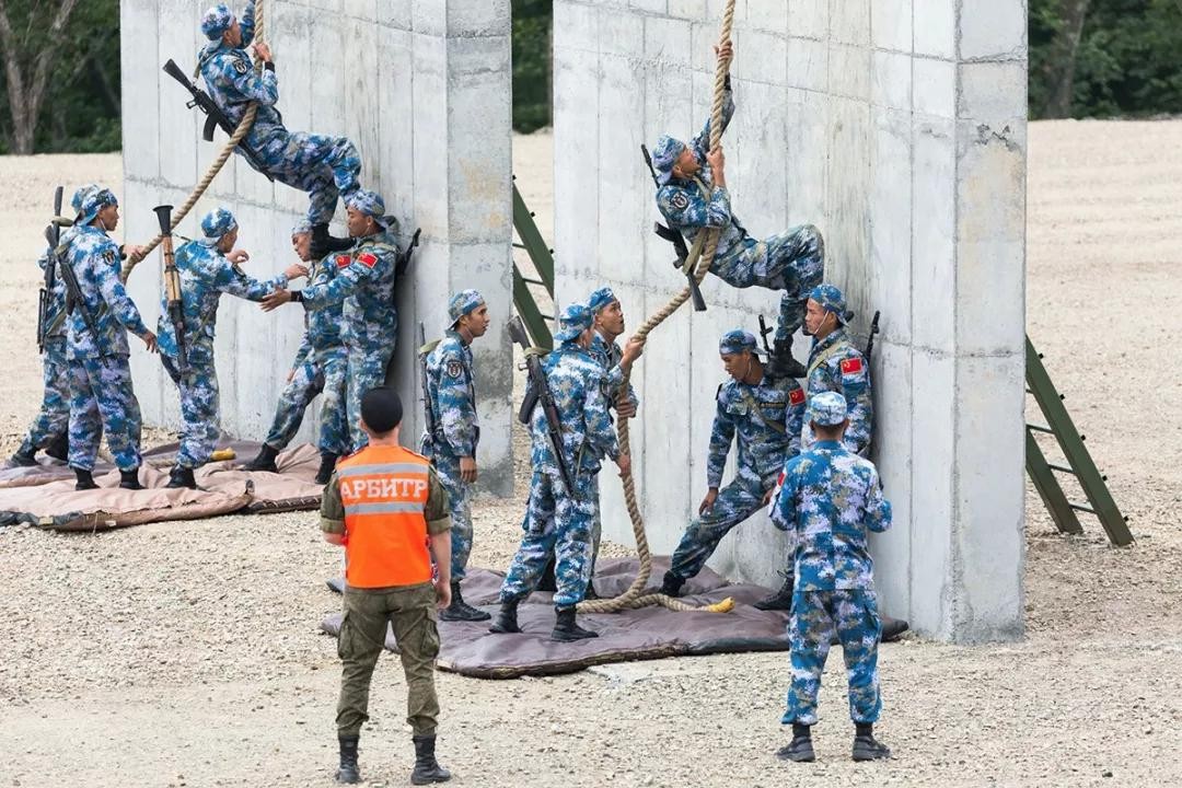 ▲中国海军陆战队背着AK74和RPG参加“海上登陆”障碍比赛