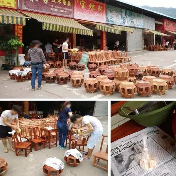 一家越南人开的店,售出灯笼凳和官帽椅各2张,小茶桌椅一套,客人付了1480元。店家用越南报纸给家具包装,还给了一点红木专用的蜡。