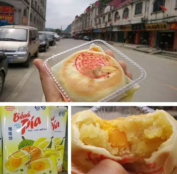 走出国门大厦,撕开一个有蛋黄的越南榴莲饼,美味~