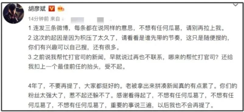 胡彦斌的经纪人陈炯赶忙在微博上发长文《生活不是你说的苟且》,回应花心质疑,并证实分手。