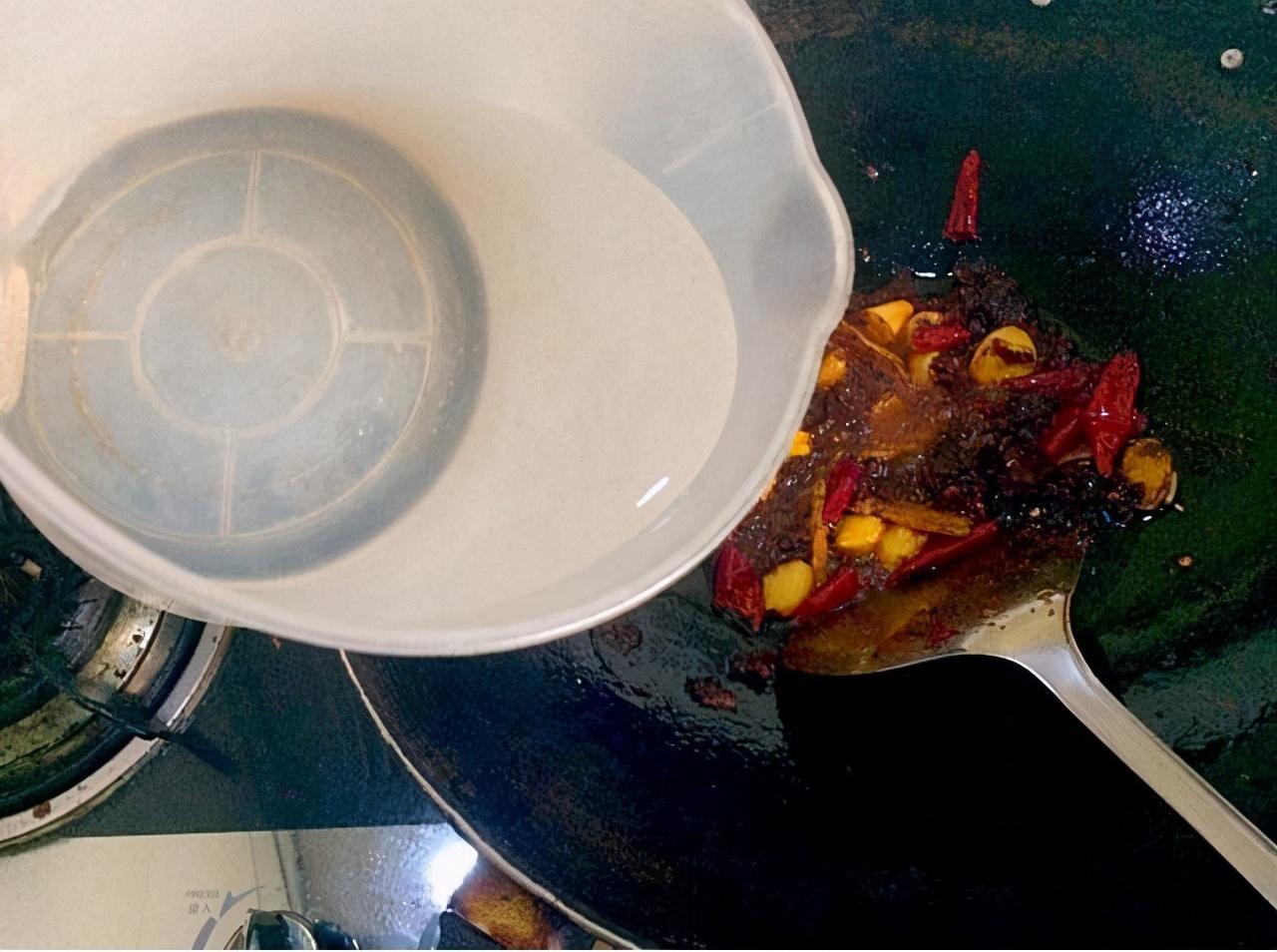 7、全部炒香后,倒入三碗清水。
