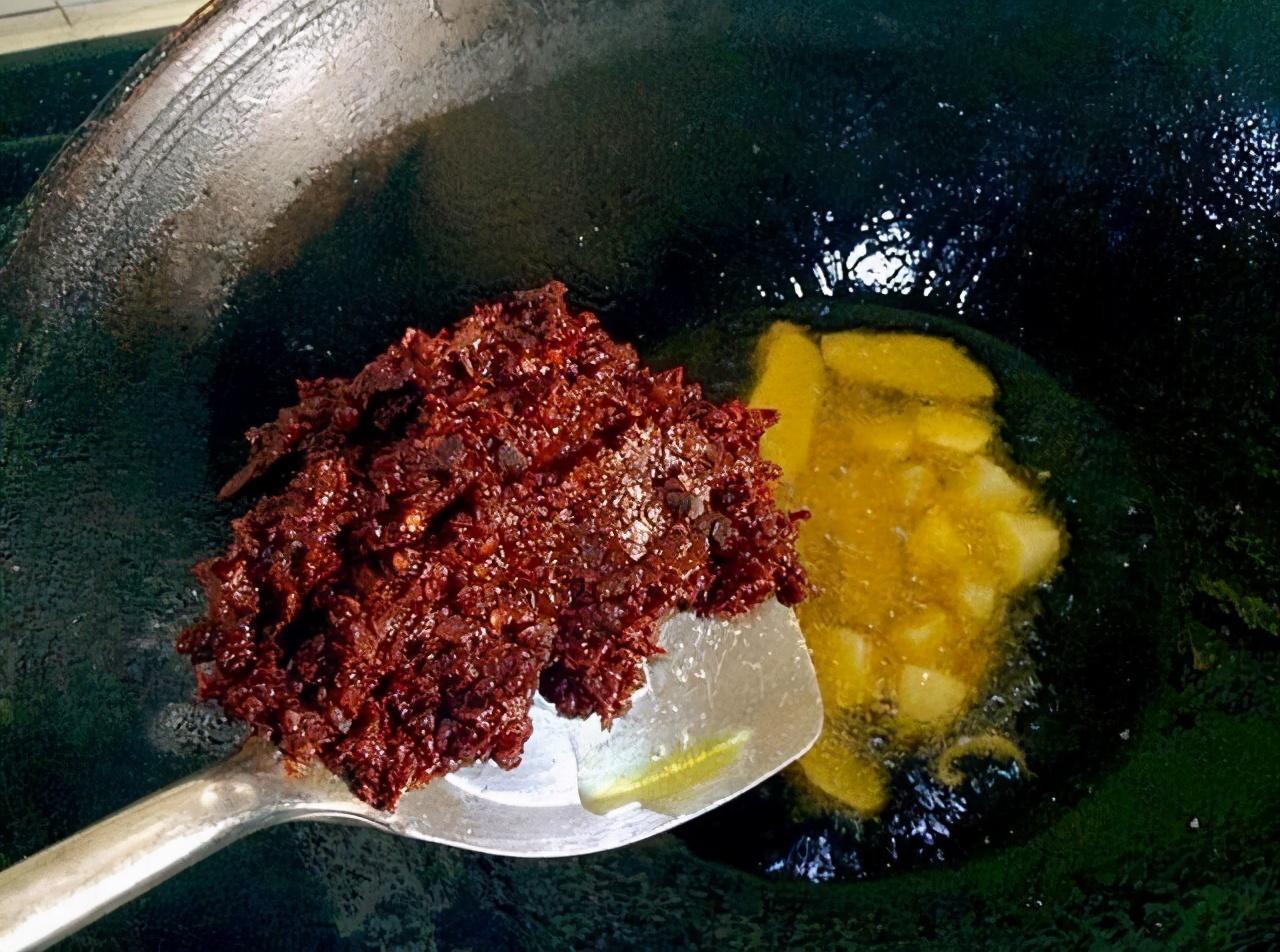 6、起锅烧油,油要比平常炒菜多一点,倒入大蒜、姜片炒香,放入一大勺郫县豆瓣酱,小火翻炒出红油,再放2个干辣椒,适量的花椒粒。
