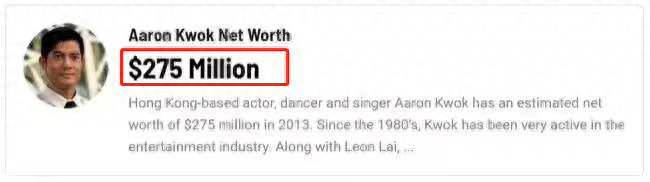 出道已经37年的郭富城,身家不菲。据了解,早在2013年,他的资产已经超过2.75亿美元,相当于近20亿人民币。此外,他名下还有无数台顶级跑车,总价值在2亿元以上。