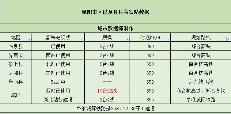 阜阳市将规划建设成7个高铁站,使得下辖区域全部开通高铁站,截止目前为止已经开通了5个高铁站,分别是临泉站、太和东站、颍上北站、界首南站和阜阳西站,其中临泉县和界首市二地的高铁站位于郑合高铁线上,而颍上县和太和县则是位于商合杭高铁线上,阜阳西站则是属于商合杭高铁和郑合高铁的交叉点站;另外还有一个高铁站待建设中,阜淮城际铁路已经于2020年12.30号官宣开工建设,在阜淮城际铁路线上还规划了阜阳新北站;最遗憾的就是阜南县了,因为阜南截至目前为止不仅没有开通使用的高铁站,也没有在建设的高铁站,不过好有一条规划的高铁线路经过,而且是国家主干线京九线将在阜南县建设高铁站。届时阜阳市不仅所有的县级单位都能圆上高铁梦,而且所有的高铁站均是位于时速350km/h的高铁线上。