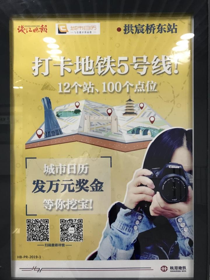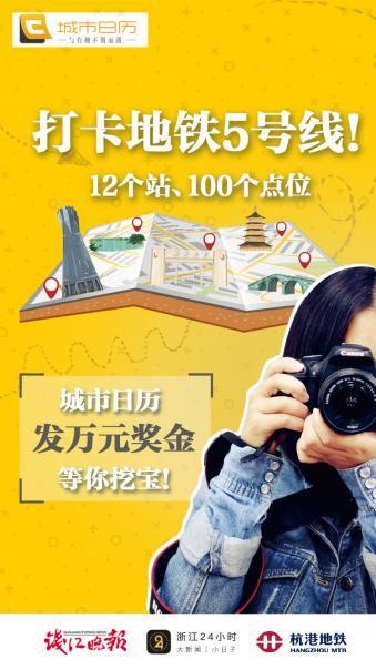 钱江晚报“城市日历”联合杭港地铁,发起“打卡杭州”特辑之“打卡地铁5号线”:在地铁5号线的12个站点,城市日历留下了100张海报,只要你完成3个站点以上的打卡动作,就有机会拿走万元现金大奖哦!