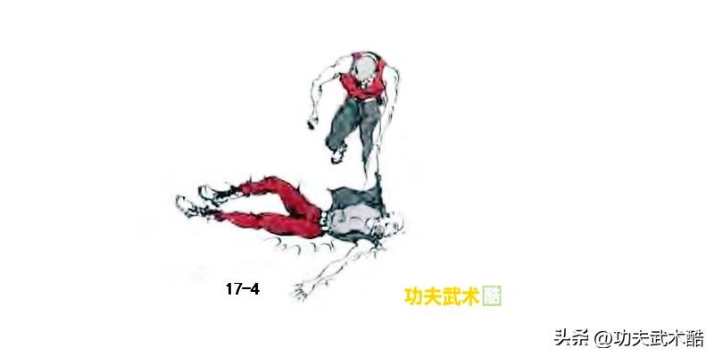 6、我方将敌方重重地摔在地上;此时我方可以继续抓住敌方右臂上提,并用脚踹敌胸肋部要害,将敌彻底制服。