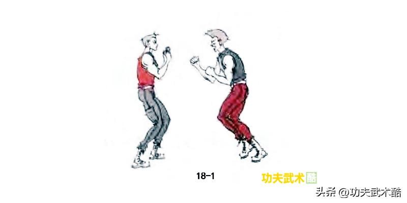 2、我方在接近敌方后,右脚迅速向前跨一步,并伸出右臂,掌心朝下,用右掌拇指一侧猛力向后钩击敌方咽喉,使敌失去平衡而后仰;