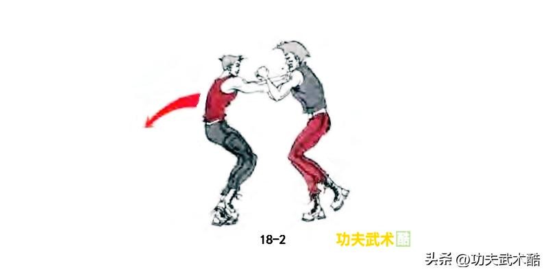 3、上动不停,我方右脚向左前方上步,同时左后转身180度,用我方右前臂顶住敌方右腋窝,左手抓住敌方右肘;