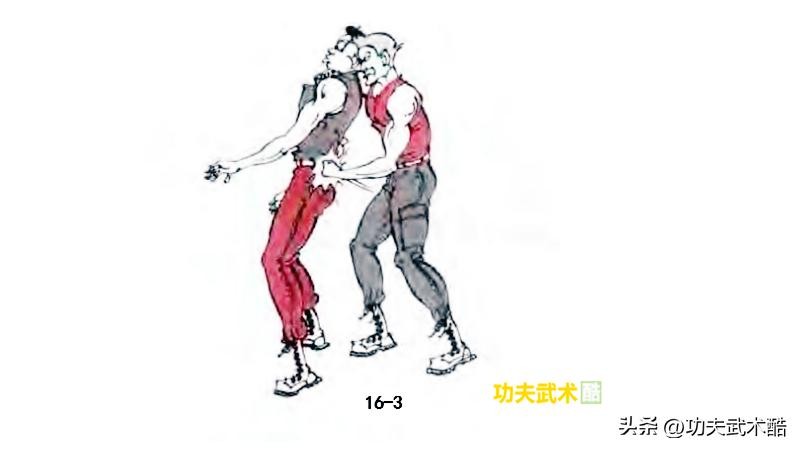3、我方右手仍紧紧钩住敌方咽喉,并用左拳猛力击打敌方腰部;左拳击中敌方腰部后,顺势顶住敌方腰部,同时右手猛力将敌方颈部往后拉;
