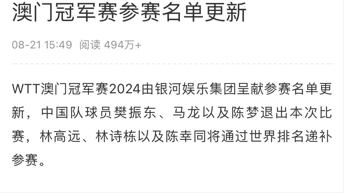 嘿,各位小伙伴们,奥运表彰大会的热度还没过呢,咱们国乒队就整了个大新闻!樊振东、马龙、陈梦这“三巨头”竟然集体退出澳门冠军赛了!