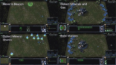 直到2018年6月,DeepMInd才宣布了研究的最新进展,他们用关系性深度强化学习在星际2六个模拟小游戏(移动、采矿、建造等)中达到了当前最优水平,其中四个超过人族天梯大师组玩家。