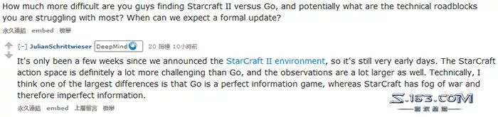 网友:你们觉得围棋与《星际争霸II》谁的研究难度更大?最大的潜在技术障碍是什么?我们期待的正式更新什么时候能出来?
