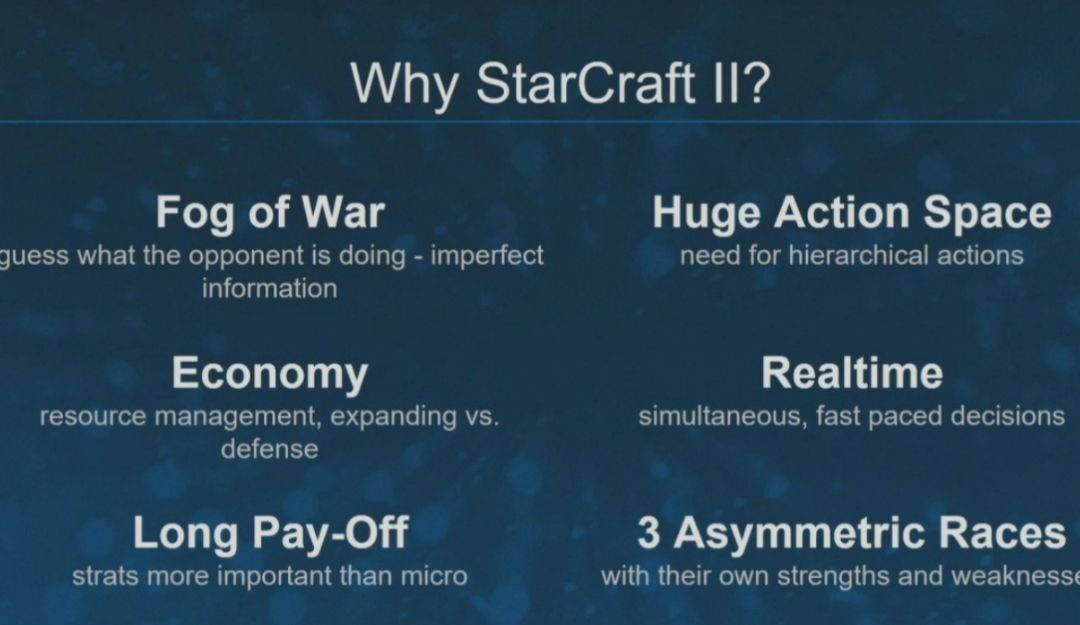 DeepMind选择星际2作为研究的原因:战争迷雾、操作空间、经济运营、及时性游戏、大局观、三个不同种族的互相对抗