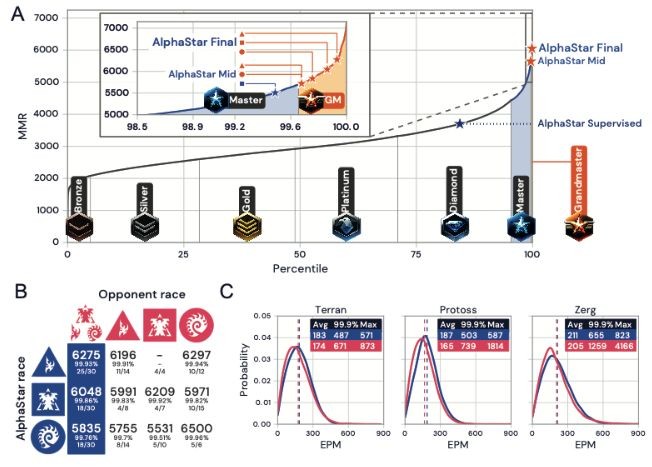 然而就在人类玩家们沾沾自喜以为“AlphaStar”这只“鸡”凉掉了的时候,今日最新一期《Nature》杂志上刊登的一篇论文打了大家的脸:“AlphaStar”在战网上的排名已超越99.8%的活跃玩家,其三个种族(人族、异虫、星灵)都打进了地区前200名,也就是我们常说的“宗师”分段。