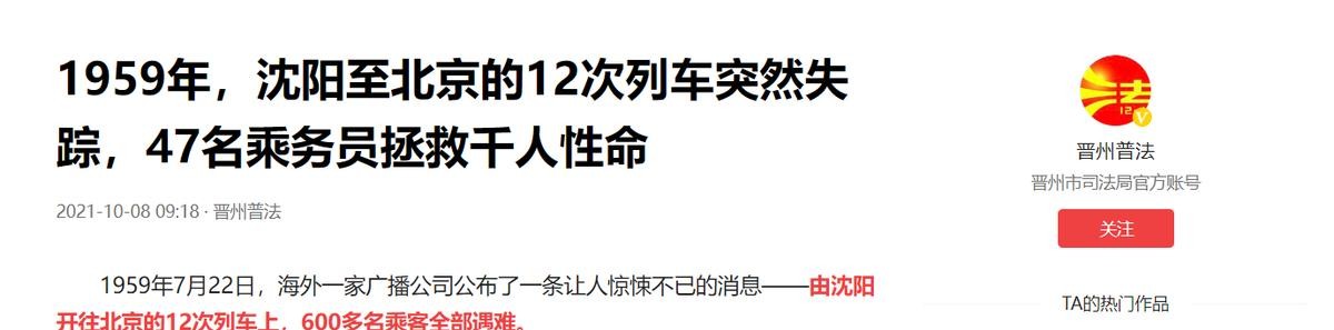 【1】 1959年,沈阳至北京的12次列车突然失踪,47名乘务员拯救千人性命 - 晋州普法