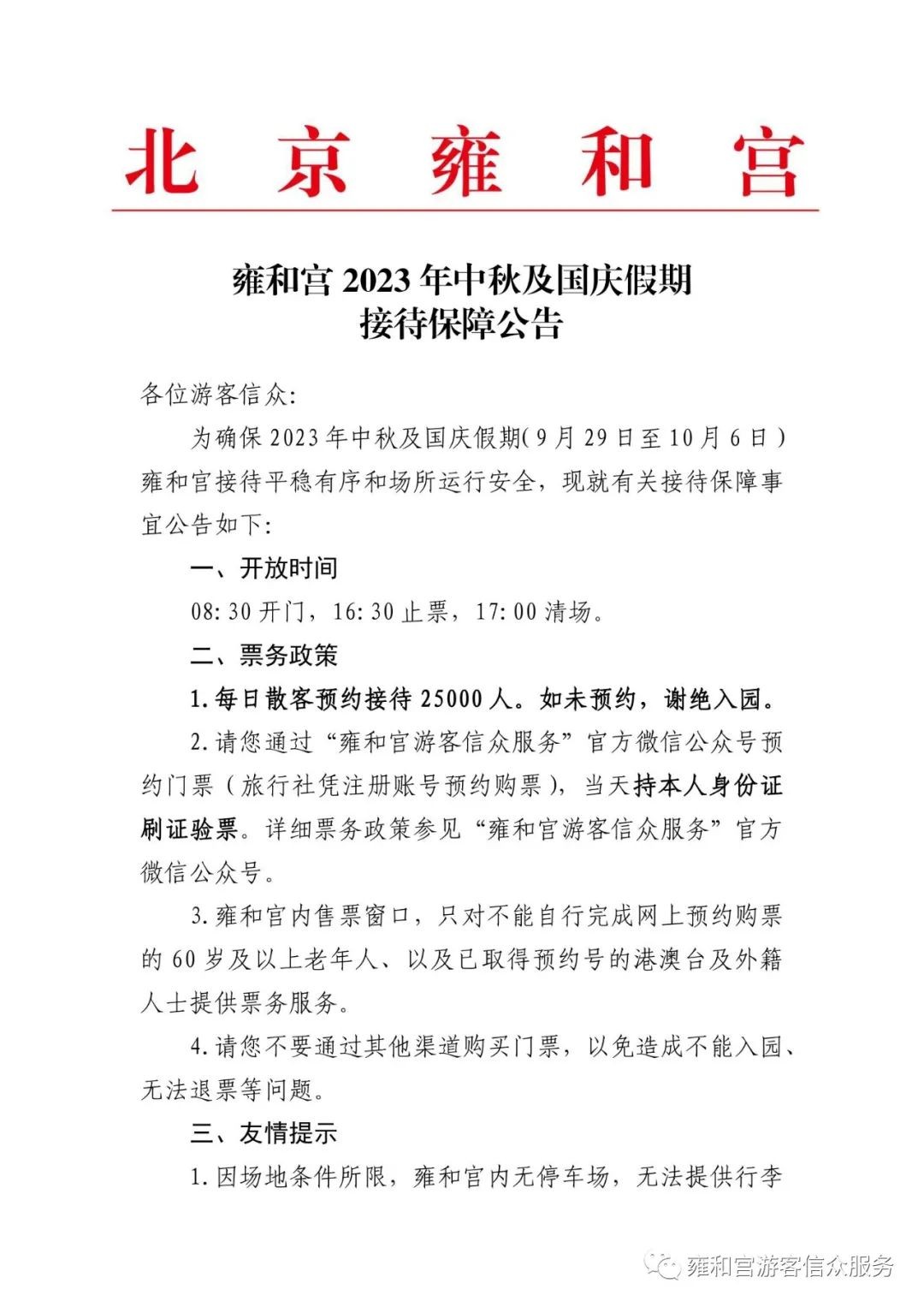 为确保2023年中秋及国庆假期(9月29日至10月6日)雍和宫接待平稳有序和场所运行安全,现就有关接待保障事宜公告如下: