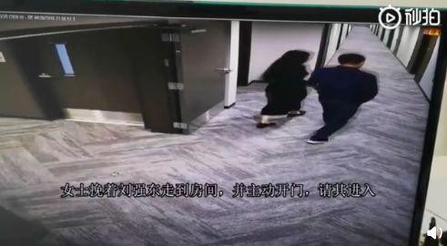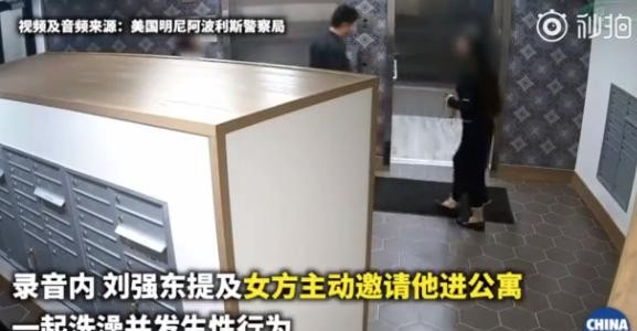 公寓内的视频显示,刘和受害者走向电梯,受害者挽着刘强东的手。