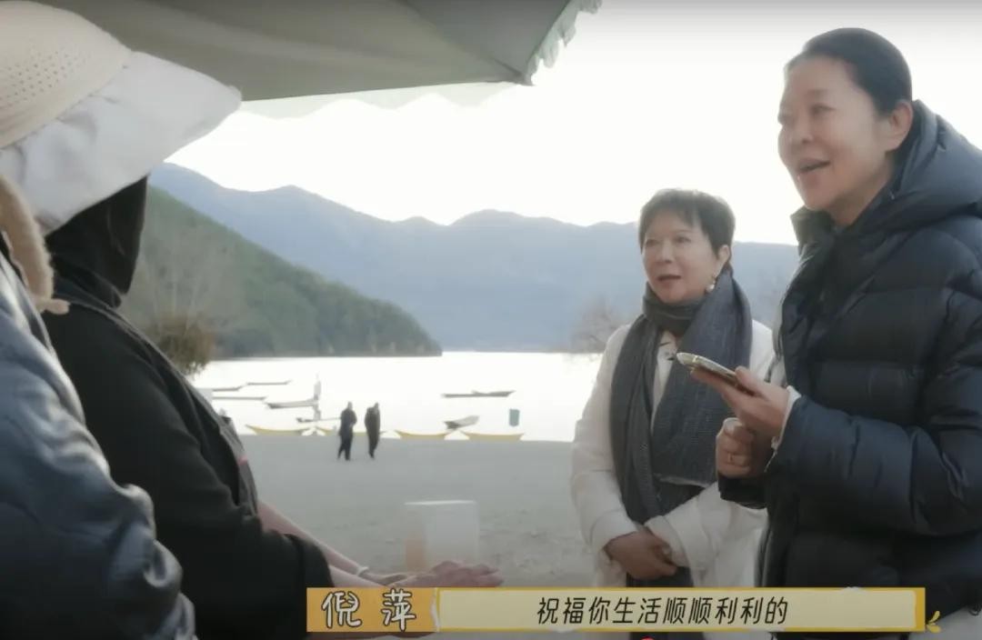 《一路繁花》中还有一幕,倪萍与蔡明与摩梭族的妇女攀谈,了解对方走婚习俗(男女双方不结婚,通过夜晚走访对方家中来实现婚烟关系,白天则各自生活在自己的母系家庭中),现在独自带着两个孩子生活。